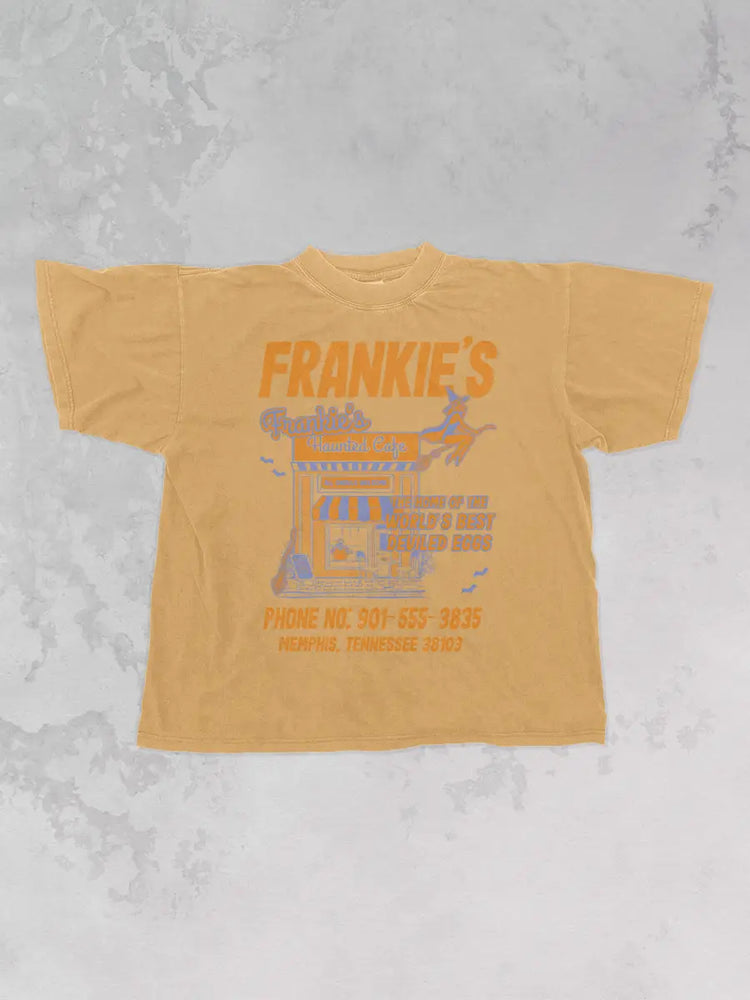 Celebrate spooky season with this oversized Halloween Frankie's Haunted Cafe oversized graphic tshirt