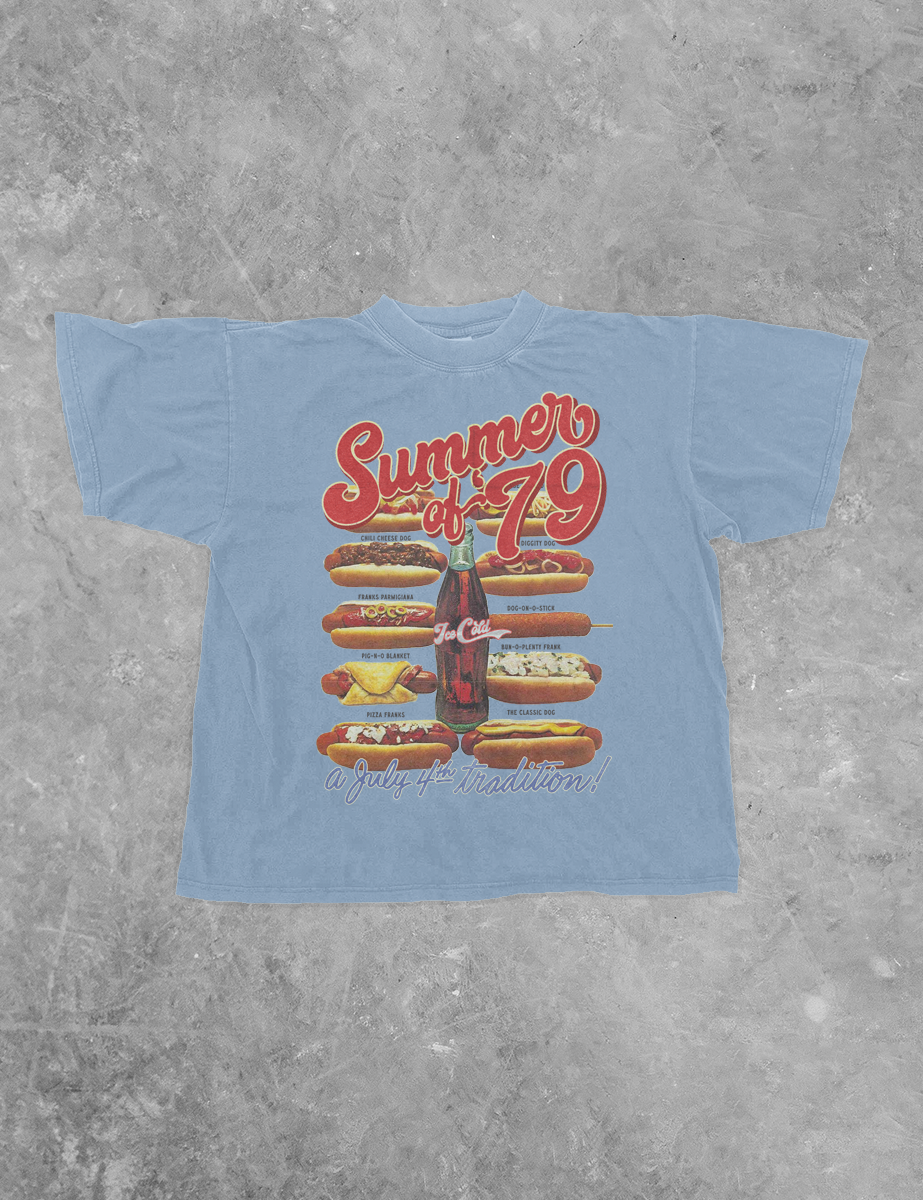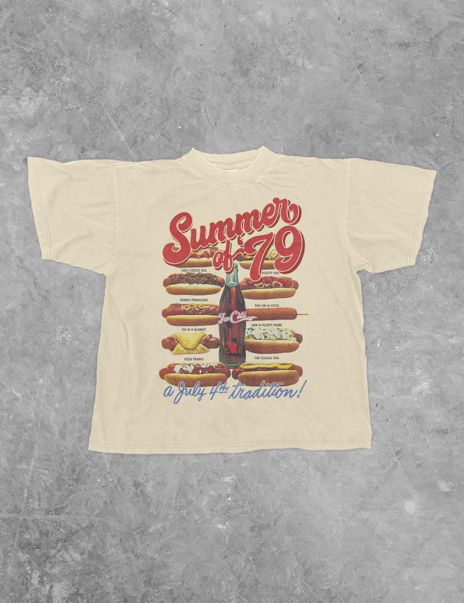 - Features "Summer of '79" across the top with different style of Hot Dogs and a Soda with "a July 4th Tradition" underneath all in a full color print