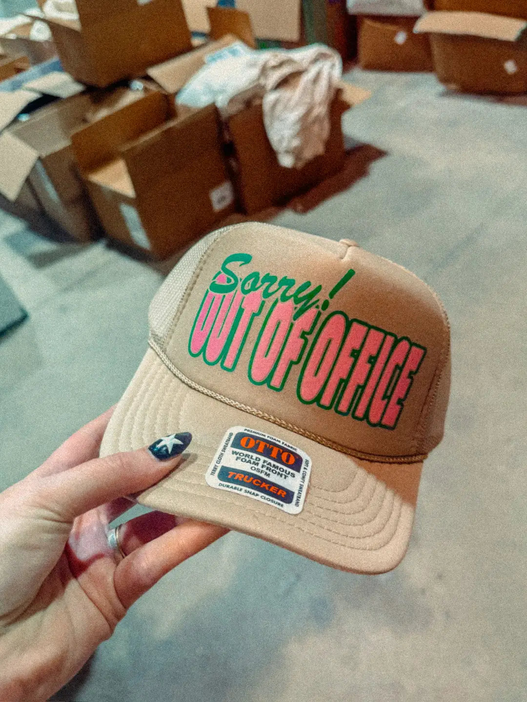 Show off your style in our Out Off Office trucker hat!
